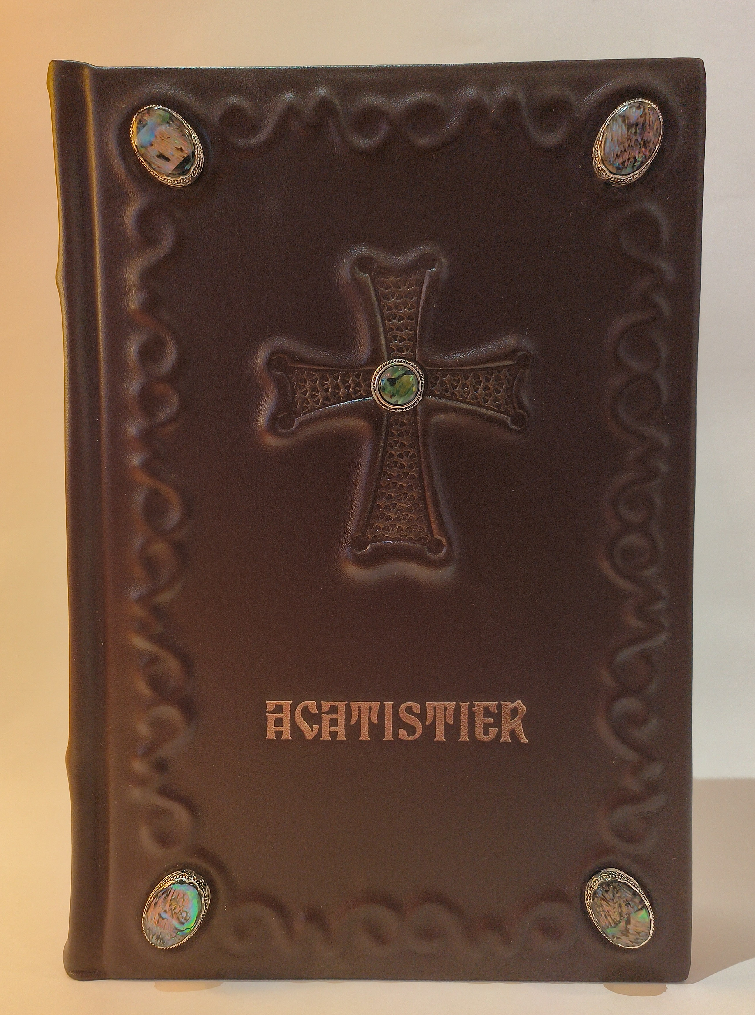 Acatistier mare piele, acesorii pietre, model unicat, husa netesut