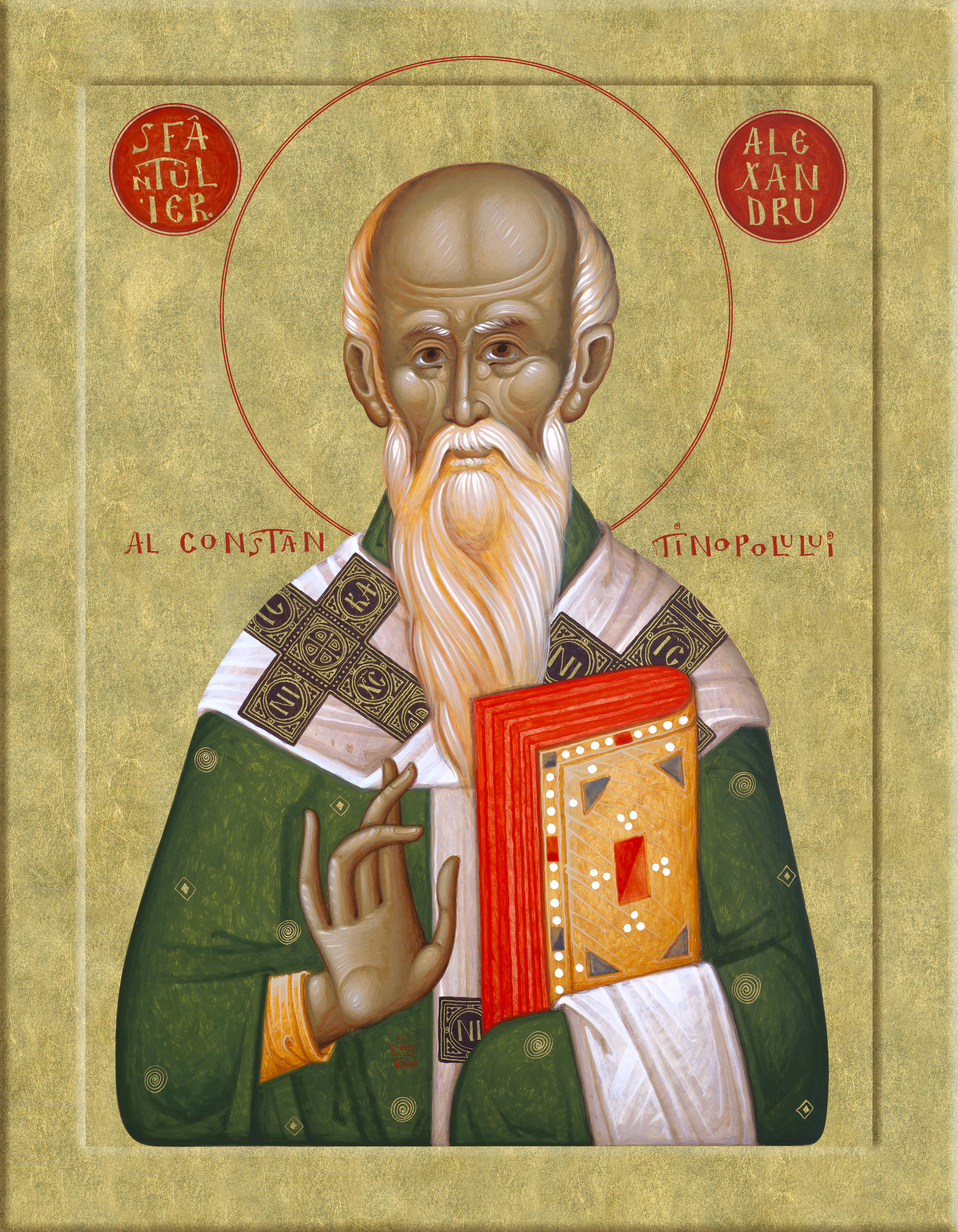 Icoana Sfantului Ierarhul Alexandru provine de la atelierul de pictura de icoane ortodoxe al Librariei Bizantine, din Bucuresti, Romania. Aceasta icoana cu foita de aur, pe panou de lemn, este o reproducere de cea mai buna calitate a icoanei Sfantului Ierarh Alexandru, pictata de iconarul Mihai Coman, dupa traditia bizantina.