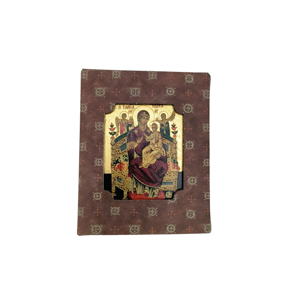 Reproducere a icoanei facatoare de minuni a Maicii Domnului Pantanassa – Imparateasa tuturor, magnet cu foita de aur, pe lemn (metaxotipie).