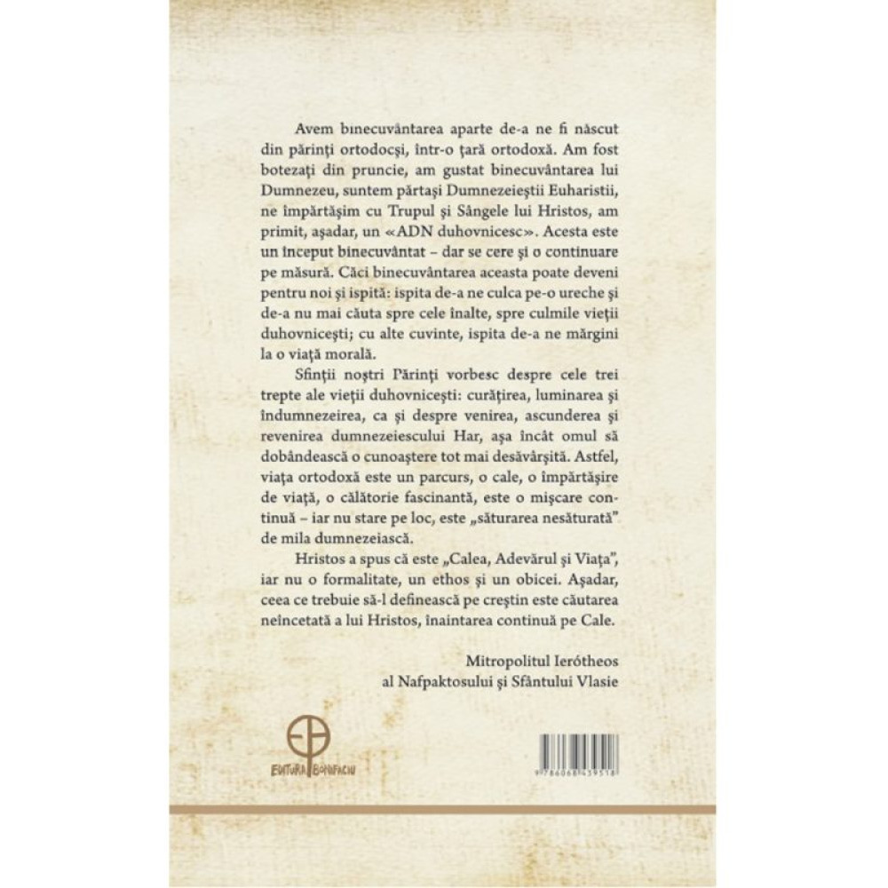 Avem binecuvantarea aparte de-a ne fi nascut din parinti ortodocsi, intr-o tara ortodoxa. Am fost botezati din pruncie, am gustat binecuvantarea lui Dumnezeu, suntem partasi Dumnezeiestii Euharistii, ne impartasim cu Trupul si Sangele lui Hristos, am primit, asadar, un «ADN duhovnicesc». Acesta este un inceput binecuvantat – dar se cere si o continuare pe masura. Caci binecuvantarea aceasta poate deveni pentru noi si ispita: ispita de-a ne culca pe-o ureche si de-a nu mai cauta spre cele inalte, spre culmile vietii duhovnicesti; cu alte cuvinte, ispita de-a ne margini la o viata morala. Astfel, viata ortodoxa este un parcurs, o cale, o impartasire de viata, o calatorie fascinanta, este o miscare continua – iar nu stare pe loc, este „saturarea nesaturata” de mila dumnezeiasca. Hristos a spus ca este „Calea, Adevarul si Viata”, iar nu o formalitate, un ethos si un obicei.