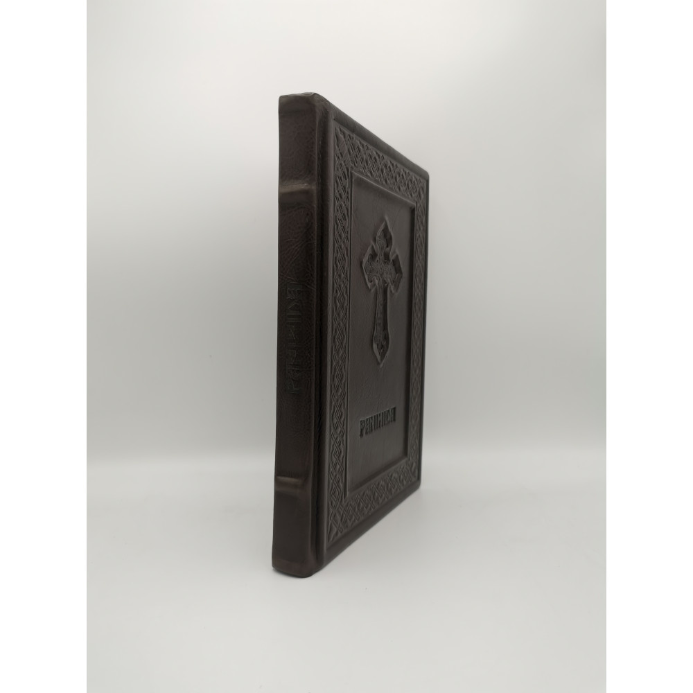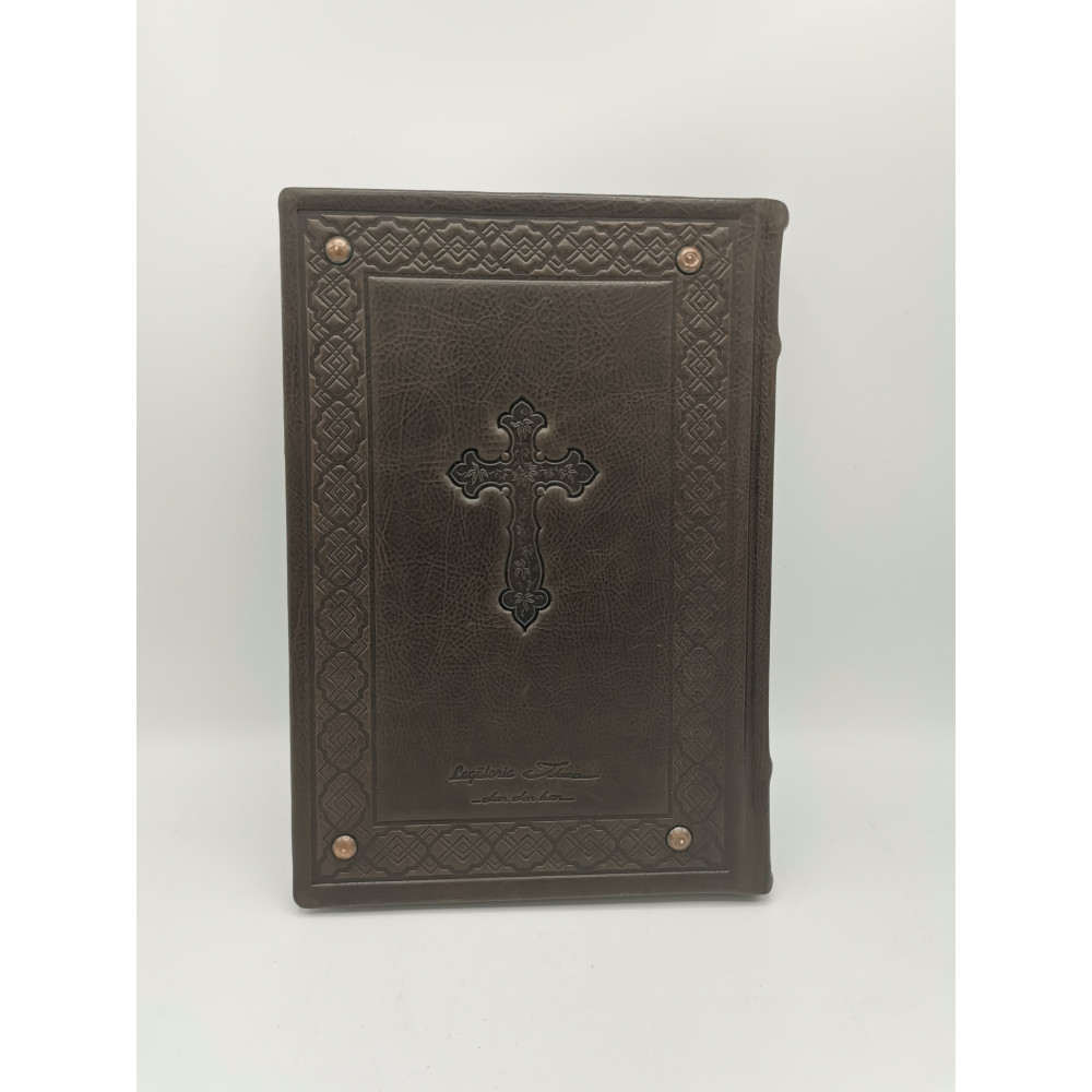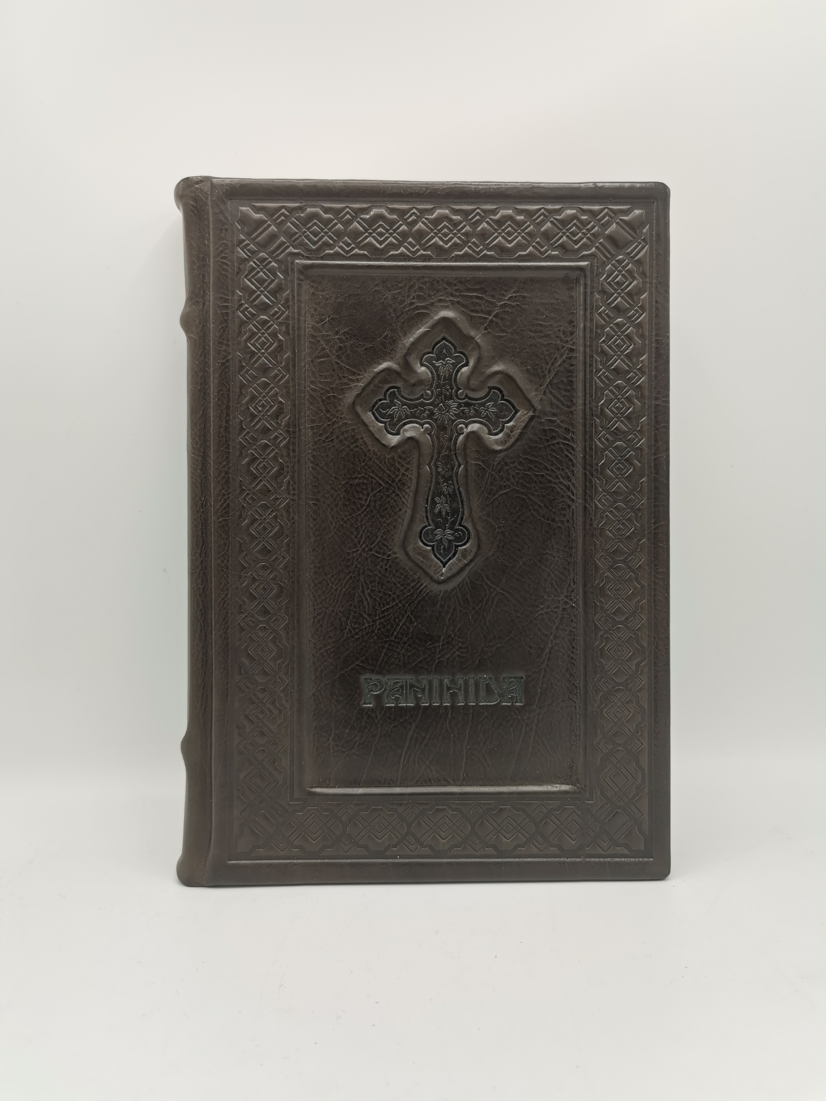 Panihida in piele naturala model in relief, obiecte realizat manual. Cotorul cartii este poleit, sporind caracterul de eleganta a obiectului. Cartea vine insotita de o husa protectoare, ceea ce confera o nota sporita de grija si atentie la detaliu.