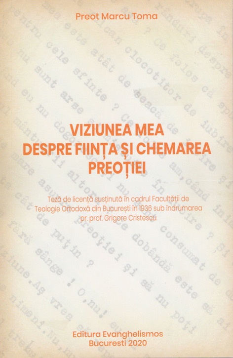 Teza de licenta sustinuta in cadrul Facultatii de Teologie Ortodoxa din Bucuresti in 1936 sub indrumarea pr. prof. Grigore Cristescu
